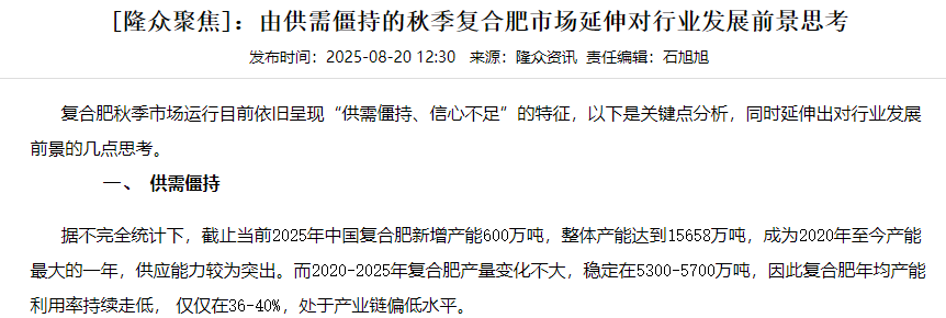 来自隆众资讯的统计数据显示,2025年我国复合肥产能突破1.5亿吨,但产量稳定在5500万吨左右,行业平均产能利用率持续走低,仅在36%-40%之间。泸天化2025年产能利用率67%。