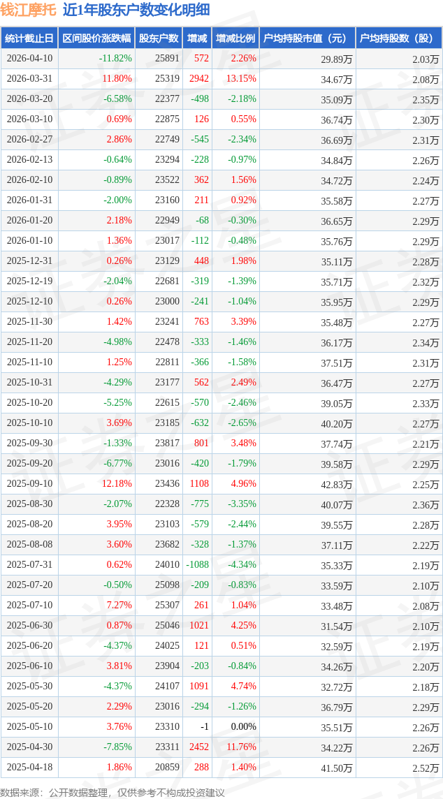 证券之星消息,近日钱江摩托披露,截至2026年4月10日公司股东户数为2.59万户,较3月31日增加572.0户,增幅为2.26%。户均持股数量由上期的2.08万股减少至2.03万股,户均持股市值为29.89万元。