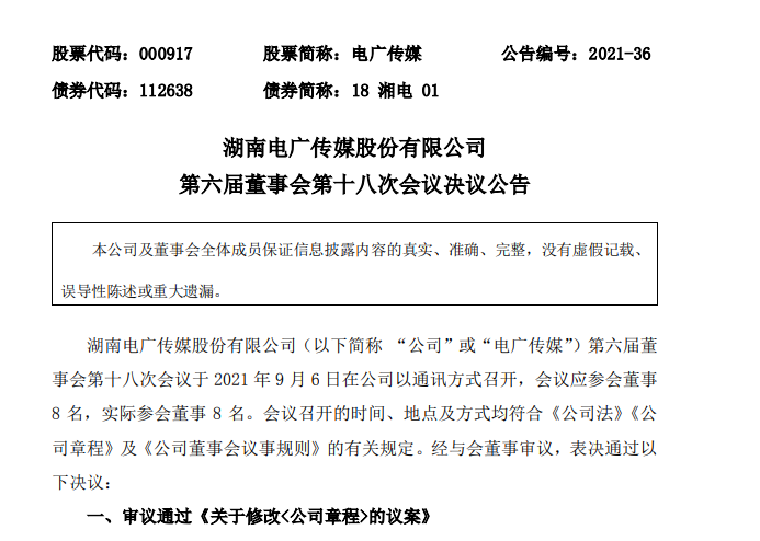 此前,电广传媒曾就修改公司章程召开了第六届董事会第十八次会议,随后发布公告称,公司已全票通过表决,将择日修改并发布。
