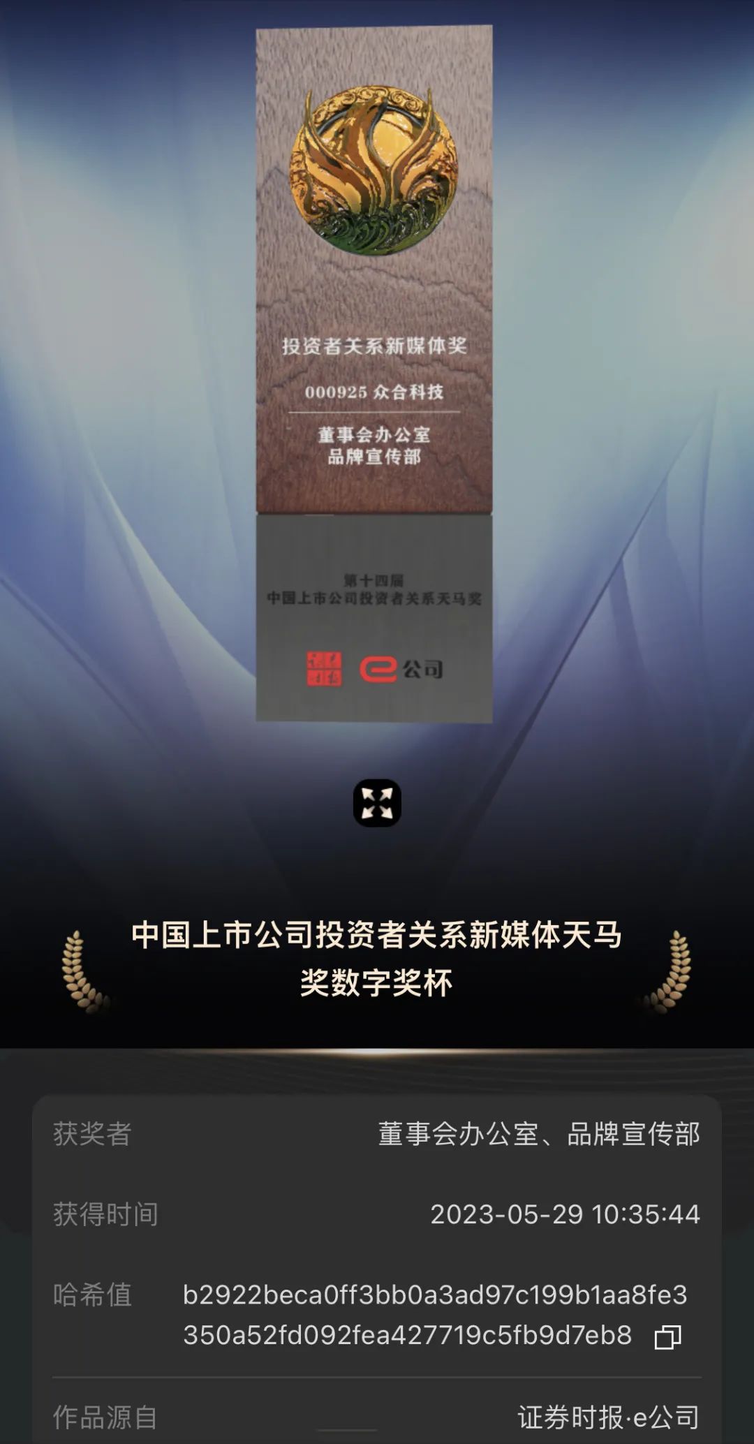 本届活动评选期间,有超过1000家上市公司积极自荐,投票近700万,通过公司自荐、专业财务筛选、公众投票、专家评审及三大交易所复审等严苛的评选流程,最终有50家企业脱颖而出获“中国上市公司投资者关系新媒体奖”。众合科技本次获此殊荣,充分体现了公司在顺应时代潮流,不断优化投关管理工作方面取得的成绩。