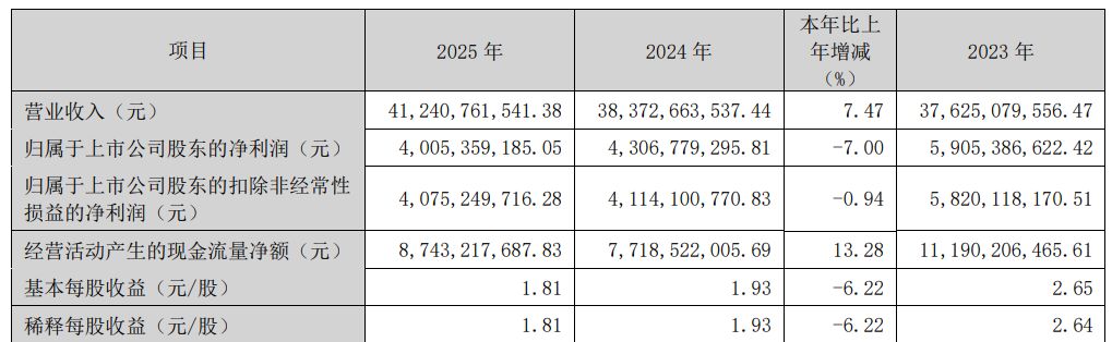3月23日晚间,神火股份(SZ000933,股价29.98元,市值674.25亿元)披露2025年年报。该年报显示,公司2025年实现营收412.41亿元,同比增长7.47%;实现归属于上市公司股东的净利润40.05亿元,同比下降7%;实现扣非净利润约40.75亿元,同比下降0.94%;基本每股收益为1.81元,同比下滑6.22%。公司拟以扣除回购专户股份后的22.3358亿股为基数,向全体股东每10股派发现金红利8.00元(含税),不送红股,不以公积金转增股本。