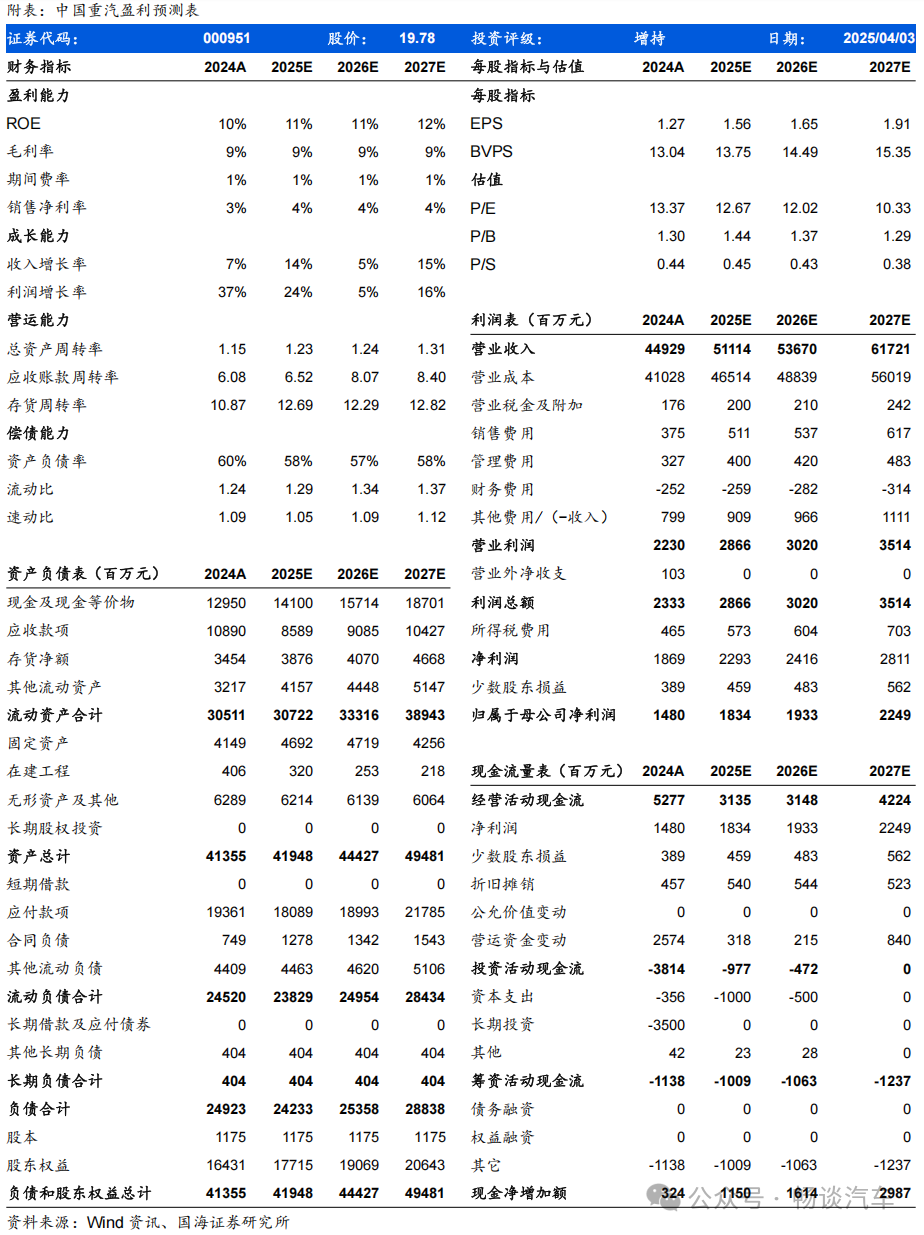 2025年中国重卡内需销量有望受老旧营运货车以旧换新政策拉动,进入景气区间。公司是国内重卡整车龙头之一,在多个细分市场表现亮眼,且截至2024年,出口份额连续二十年占据行业首位。我们认为公司具备较高经营杠杆,利润具有较大向上弹性。我们预计公司2025-2027年实现营业总收入511、537与617亿元,同比增速14%、5%与15%;实现归母净利润18.34、19.33与22.49亿元,同比增速为24%、5%与16%。EPS为1.56、1.65与1.91元,对应当前股价的PE估值分别为13、12与10倍,维持“增持”评级。