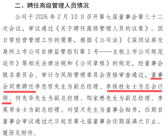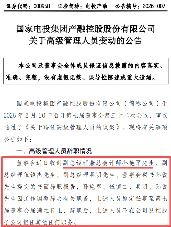近日,深交所主板上市公司电投产融(000958.SZ)发布了《关于高级管理人员变动的公告》。公告显示,副总经理兼总会计师孙艳军先生因工作调整辞去有关职务,辞职后不在公司及控股子公司担任其他任何职务。董事会同意聘任李铁枝女士为总会计师。