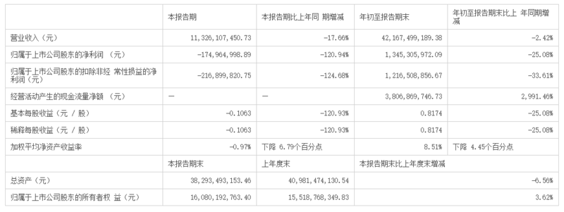 10月28日,锡业股份发布2022年三季度报告显示,三季度营收为11,326,107,450.73元,同比减17.66%;前三季度营收为42,167,499,189.38元,同比减2.42%。三季度归属于上市公司股东的净利为-174,964,998.89元,同比减120.94%;前三季度归属于上市公司股东的净利为1,345,305,972.09元,同比减25.08%。