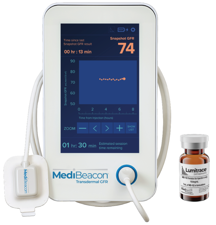 MediBeacon?作为全球首创医疗器械产品,突破了现有GFR检测方法的时间和空间限制,配合荧光示踪剂MB-102注射液(Relmapirazin),可将组织的荧光示踪剂清除率通过专利算法实时转换为GFR,并在主机上显示,对肾功能不全相关临床应用场景诊断和治疗具有突破性的意义,极大地提高了临床肾病检测的效率和便利性。