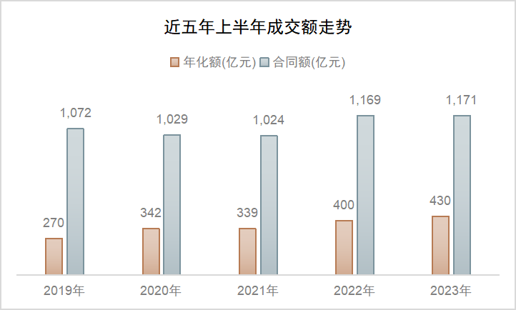 其中,年化总额再创新高,在2022年上半年的高位上增长7.5%,预计全年成交年化总额有望首次突破千亿大关。