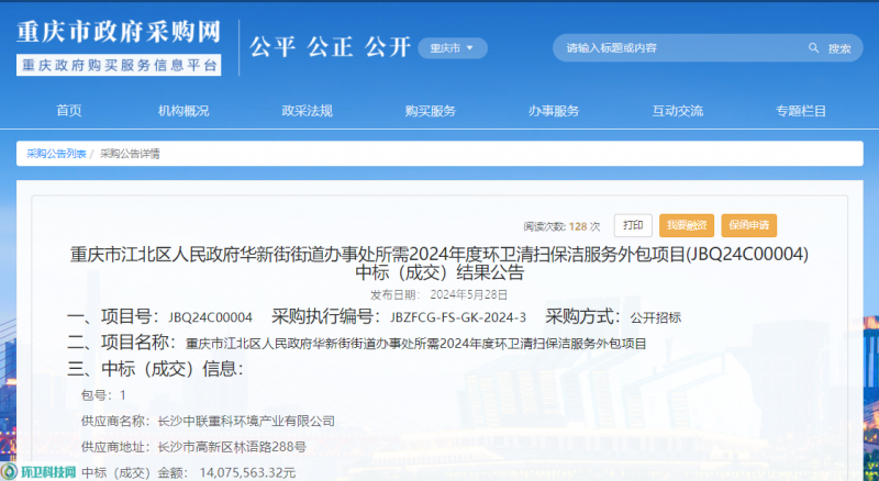 5月28日,华新街街道办事处所需2024年度环卫清扫保洁服务外包项目中标结果公布,盈峰子公司长沙中联重科环境产业有限公司中标,中标金额14,075,563.32元,服务期最长不超过3年。