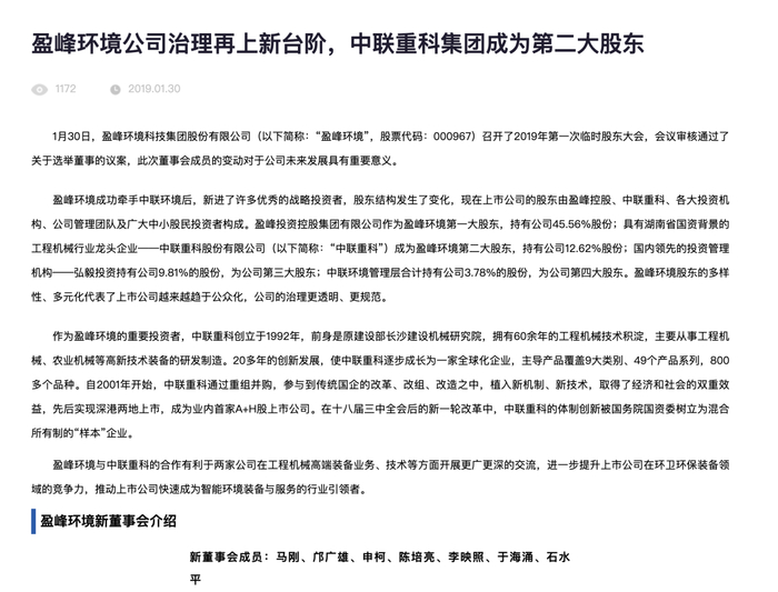 当时盈峰环境还在其官网以“盈峰环境公司治理再上新台阶,中联重科集团成为第二大股东”为题盛赞盈峰环境股东的多样性、多元化代表了上市公司越来越趋于公众化,公司的治理更透明、更规范并表示此次新董事的加入不仅有利于公司治理的优化,还充分代表了上市公司广大股东的利益。