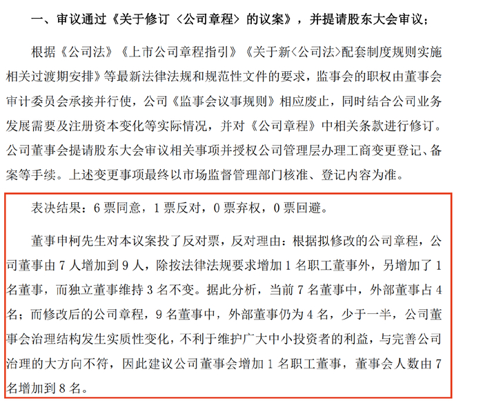 “据此分析,当前7名董事中,外部董事占4名;而修改后的公司章程,9名董事中,外部董事仍为4名,少于一半,公司董事会治理结构发生实质性变化,不利于维护广大中小投资者的利益,与完善公司治理的大方向不符,因此建议公司董事会增加1名职工董事,董事会人数由7名增加到8名。”申柯表示。