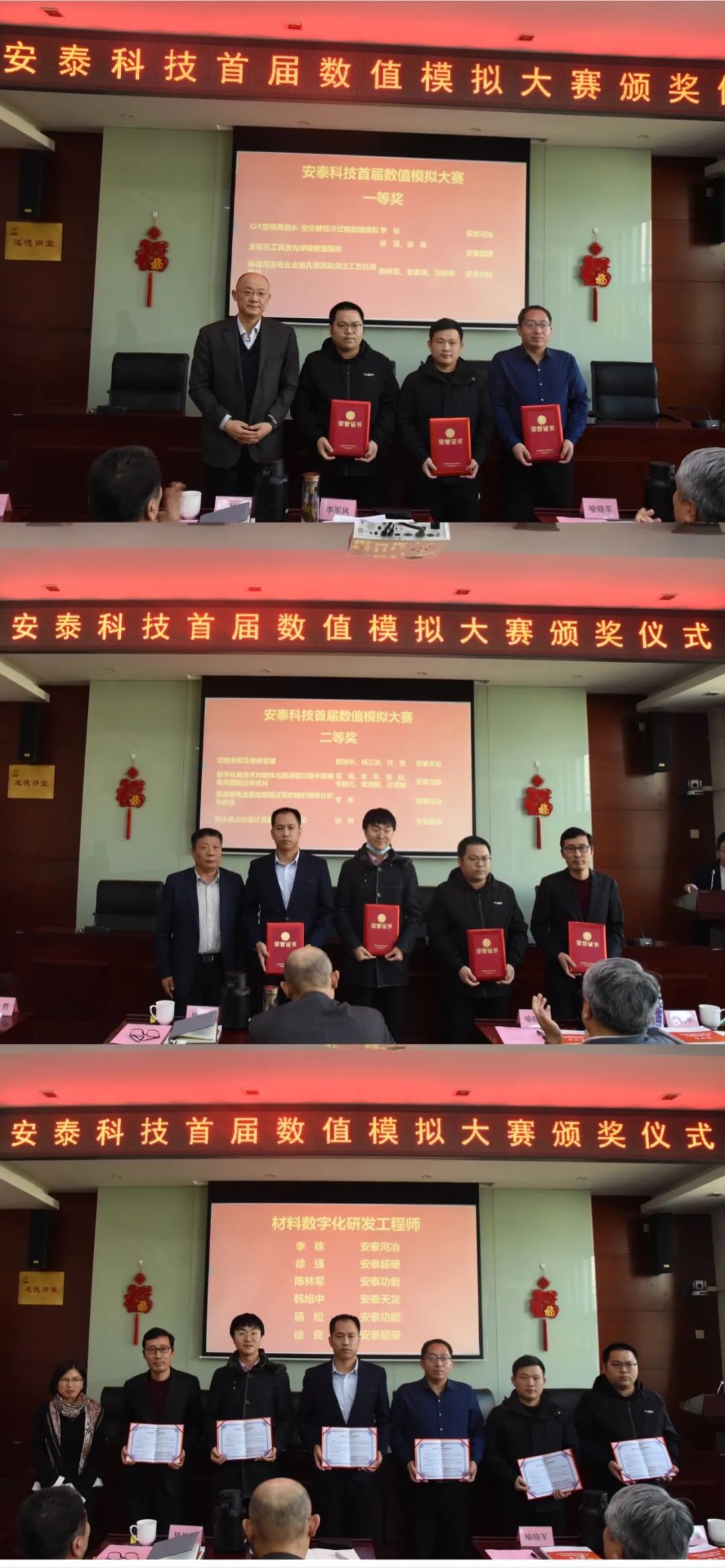为提高数字化研发能力,营造数字化研发生态,加快推进公司数字化转型,12月22日,安泰科技召开首届数值模拟大赛颁奖仪式暨数字化研发工作会。公司党委书记、董事长李军风等班子成员,公司技术创新委员会委员,数字化研发专员,大赛获奖代表,研发新星等相关人员参加会议。集团公司研究生院邓陈虹副院长、数字化研发中心刘和平副主任应邀出席。会议由王铁军副总经理主持。