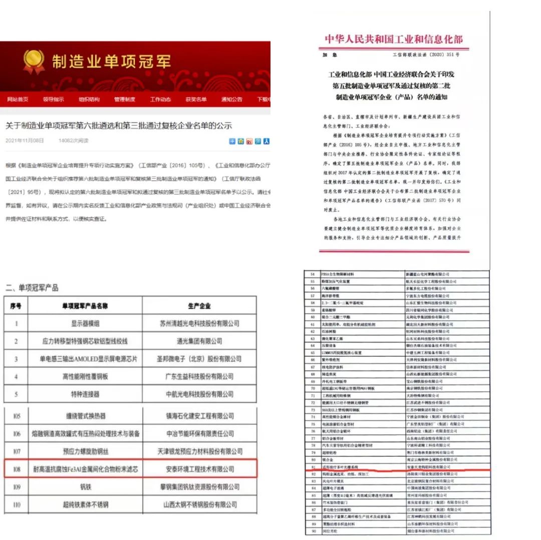 工业和信息化部、中国工业经济联合会公布了第五批、第六批制造业单项冠军企业(产品)名单,公司控股子企业安泰天龙钨钼科技有限公司的“适形放疗多叶光栅系统”以领先的技术优势和品质实力,获评全国第五批制造业单项冠军产品。安泰科技下属安泰环境公司主营的耐高温抗腐蚀Fe3Al金属间化合物粉末滤芯上榜工业和信息化部第六批制造业单项冠军产品名单。是对公司在难熔材料及制品领域重要地位与强大实力的充分认可。