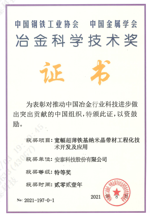 8月19日,2021年中国钢铁工业协会和中国金属学会“冶金科学技术奖”评审结果揭晓,由中国钢研科技集团公司推荐,安泰科技股份有限公司牵头申报的“宽幅超薄铁基纳米晶带材工程化技术开发及应用”项目获得“2021年冶金科学技术奖”特等奖。这是安泰科技非晶纳米晶产业又一次实现跨越式发展的里程碑。