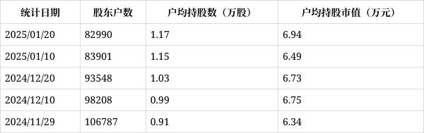 从1月23日公开信息显示,佛塑科技截至2025年1月20日公司股东户数为8.30万户,较上期(2025年1月10日)减少911户,降幅为1.09%,变化不大。