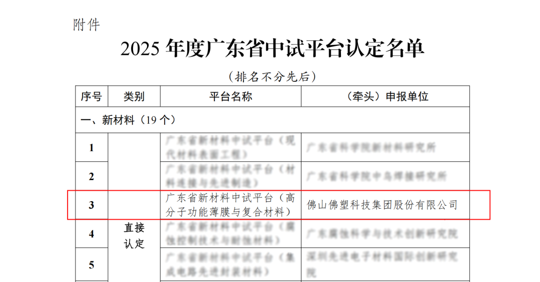 近日,广东省发展改革委发布了《关于认定2025年度广东省中试平台的通知》。佛塑科技“高分子功能薄膜与复合材料”入选广东省新材料中试平台认定名单。
