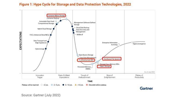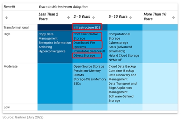 近日,Gartner公布2022年存储和数据保护技术成熟度曲线(Hype Cycle for Storage and Data Protection Technologies, 2022),软件定义存储基础设施成为本年度唯一的变革性技术,分布式文件系统、对象存储、容器原生存储优先级评级均为“高”。浪潮存储入选分布式存储代表性厂商。