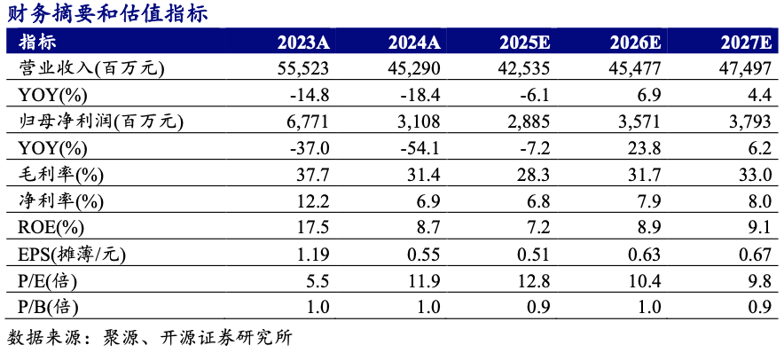 公司发布2024年报及2025一季报,2024年实现营收452.9亿元,同比-18.4%,归母净利润31.1亿元,同比-54.1%,扣非归母净利润30.2亿元,同比-55.8%;其中2024Q4实现营收122亿元,环比+5.9%,归母净利润2.6亿元,环比-70.2%,扣非归母净利润2.5亿元,环比-71.4%。2025Q1实现营收90.3亿元,同比-14.5%,归母净利润6.8亿元,同比-28.3%,扣非归母净利润7.3亿元,同比-19.1%。我们维持2025-2026年盈利预测并新增2027年盈利预测,预计2025-2027年归母净利润28.9/35.7/37.9亿元,同比分别-7.2%/+23.8%/+6.2%;EPS为0.51/0.63/0.67元,对应当前股价PE分别为12.8/10.4/9.8倍。公司产能有望受益于新拍矿及集团资产注入而提升,维持“买入”评级。