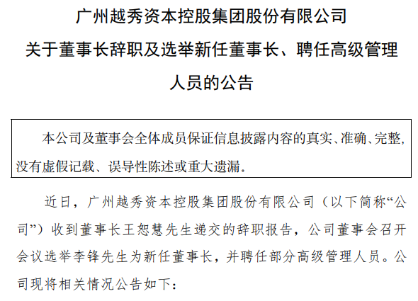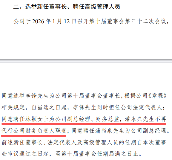 2026年1月13日,深交所主板上市公司越秀资本(000987.SZ)发布的公告显示,公司董事会同意聘任林颖女士为公司副总经理、财务总监,潘永兴先生不再代行公司财务负责人职责。