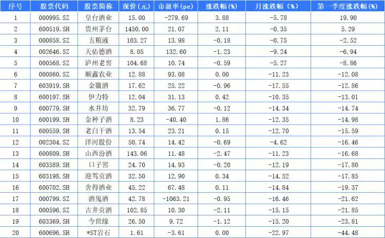 今年一季度,皇台酒业涨了19.90%。茅台呢?5.29%。五粮液?跌了2.52%。