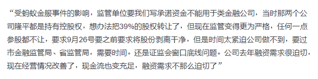 “受蚂蚁金服事件的影响,监管单位要我们写承诺资金不能用于类金融公司,当时那两个公司隆平都是持有控股权,想办法把39%的股权转让了,但现在监管变得更为严格,任何一点参股都不让,要求9月26号要之前要求将股份剥离干净,但是时间太紧迫公司做不到,要过市金融监管局、省监管局,需要时间。还是证监会窗口底线问题。公司去年融资需求很迫切,现在经营情况改善了,现金流也变充足,融资需求不那么迫切了”