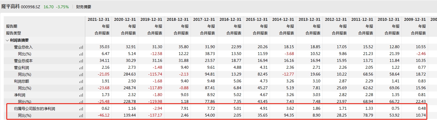 财务数据显示,2000年至2018年隆平高科业绩整体稳步增加,2018年净利润达到7.91亿元。2019年,公司业绩断崖式下挫,亏损2.94亿元。此后的2020年和2021年净利润转正,但也仅为1.16亿元和0.62亿元。