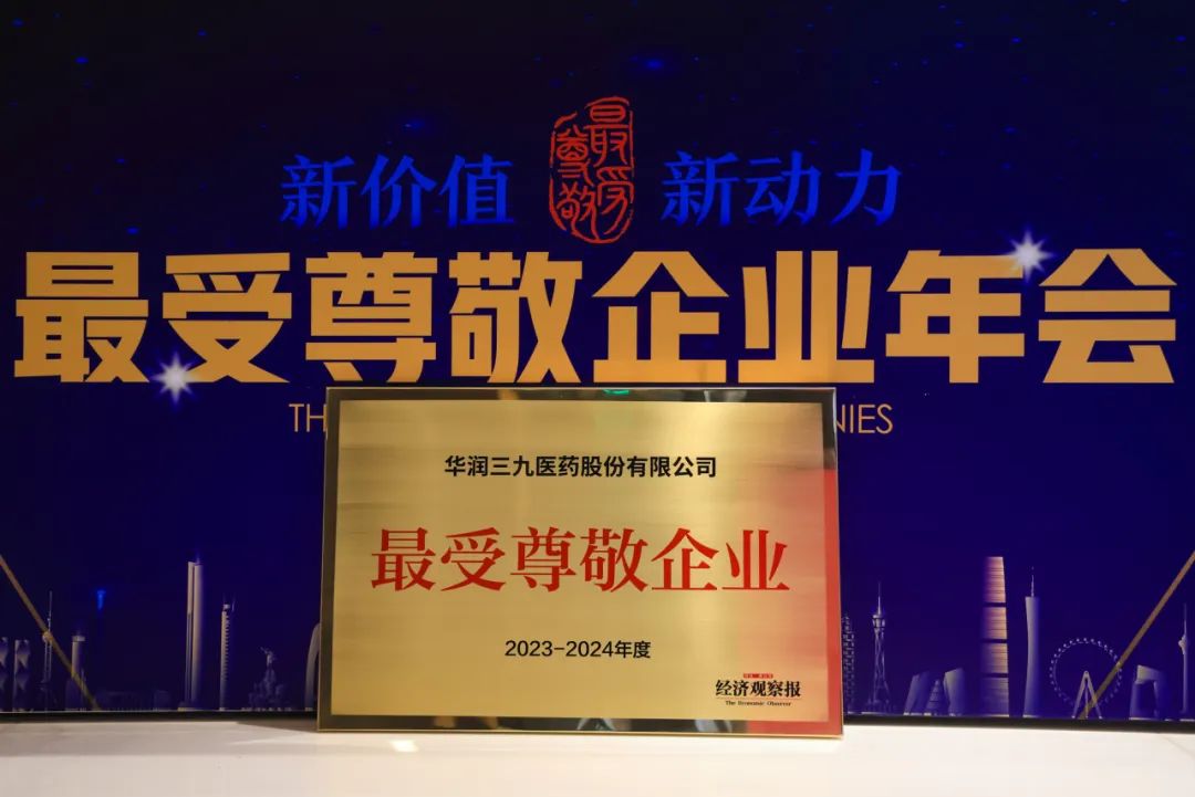 6月18日,在《经济观察报》主办的“2023-2024年度中国最受尊敬企业年会”上,华润三九凭借卓越的商业价值和责任担当,获颁“2023-2024年度最受尊敬企业奖”。