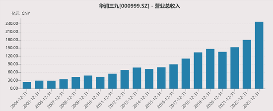 和天士力业绩走下坡路不同,华润三九只在2020年下滑大约8%外,2021年至2023年这三年营收增速始终保持在两位数以上分别是12%、16%、37%,去年完成247亿元营收。
