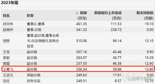 根据年报披露,2021年至2023年,王雁飞三年薪酬分别是251万元、217万元、257万元,2023年薪酬在高层中排在第七位,董事长邱华伟以461万元,排在高层薪酬第一。此外,王雁飞还持有公司16.64万股股票。