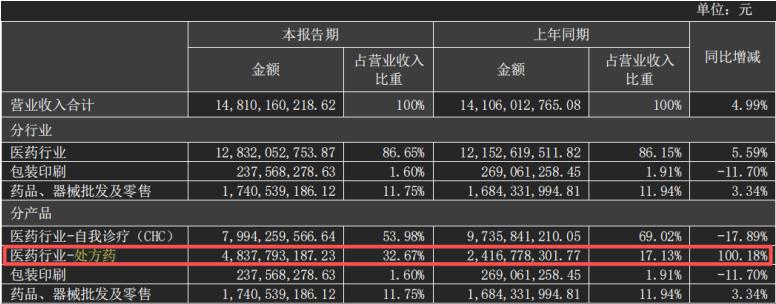 中报显示, 华润三九 处方药收入约48亿元,同比增长高达100.18%。