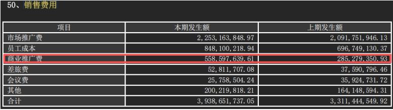 从中报披露的明细来看,公司商业推广费用上半年花费5.59亿元,同比接近翻倍,增幅接近96%。
