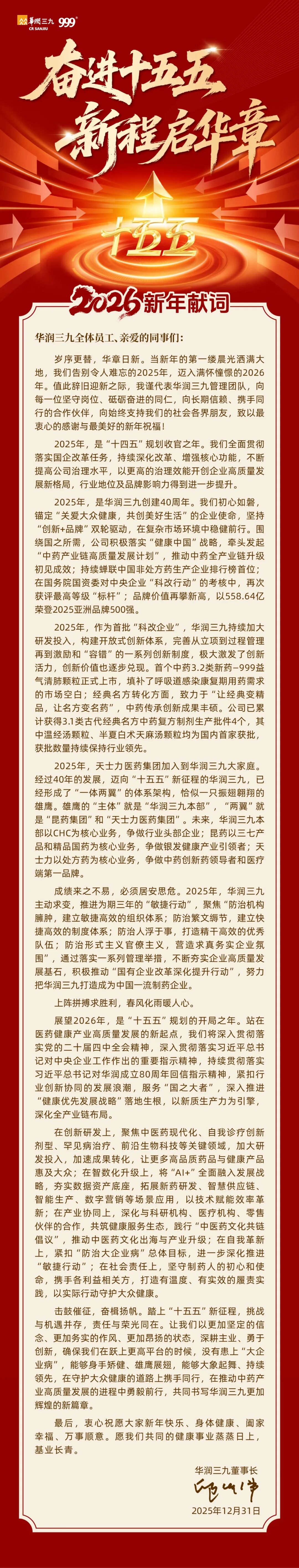 华润三九邱华伟董事长2026新年献词