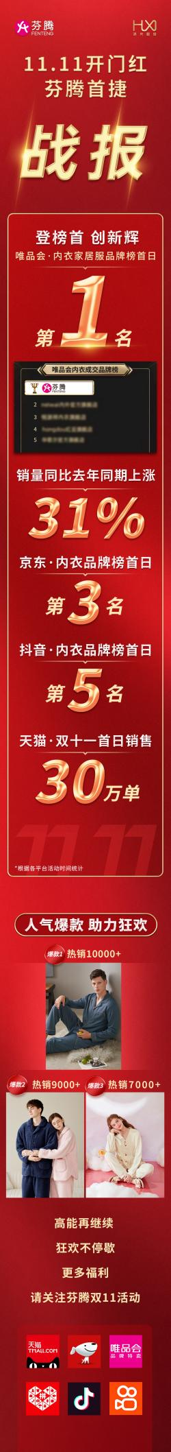 经过多年的市场培育,双十一购物节已经成为平台、商家、消费者心中约定俗成的年度大促,也是一场谁都不想缺席的消费盛宴。尽管今年双十一的声势相对平淡,但是平台取得的业绩仍是体现出长期蓄水一朝爆发的成效。而随着近年平台之间的博弈,双十一的生态对消费者和品牌方都越来越友好。以洪兴股份为例,公司在未大幅增加投放费用的前提下,在各大平台仍取得了较好的销售排名。双十一正式开始的10月31日当晚,公司旗下家居服品牌芬腾在唯品会排名销量第一,京东排名前三,抖音则排名整个内衣品类第五名。而在天猫上,公司当晚的销量是三十万单。
