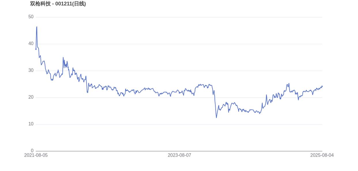 双枪科技自2021年8月5日上市至今,已迎来4周年。从上市首日收盘价为38.02元、市值27.37亿元,到如今市值达到17.40亿元。