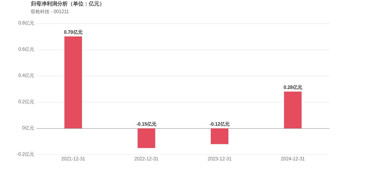 双枪科技上市的2021年,当年实现归母净利润0.70亿元。截至最新完整财年的2024年,公司实现0.28亿元的归母净利润,近年累计下降了59.56%。这4年间,双枪科技有2年出现亏损。