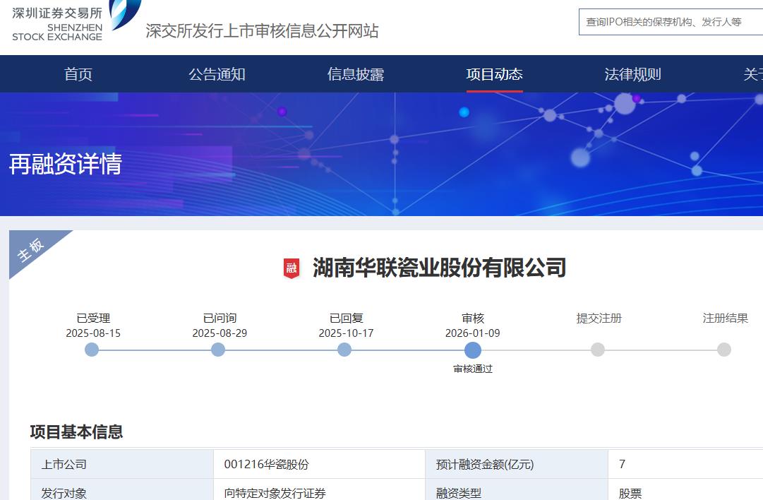 中国经济网北京1月12日讯华瓷股份(001216.SZ)向特定对象发行证券事项9日获得深交所审核通过。