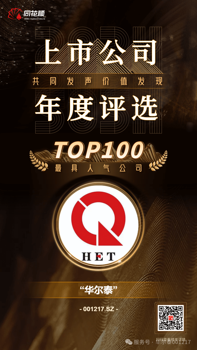 2024年12月26日,“共同发声,价值发现”2024同花顺上市公司年度榜单正式公布!华尔泰荣登"最具人气上市公司TOP100"年度榜单。