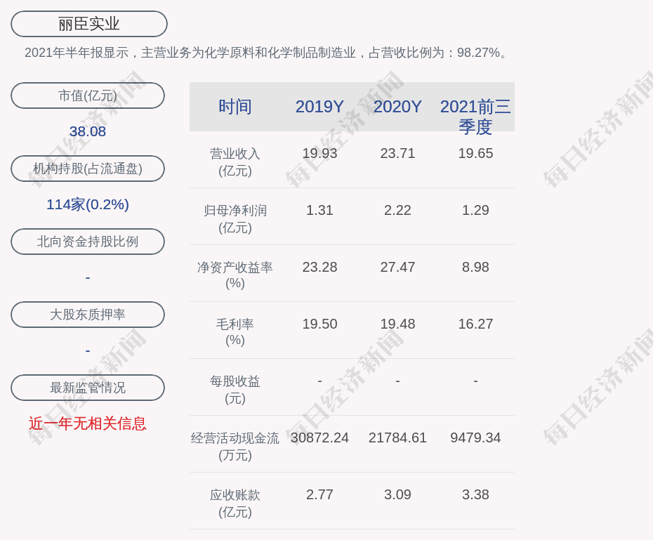 2021年半年报显示,丽臣实业的主营业务为化学原料和化学制品制造业,占营收比例为:98.27%。