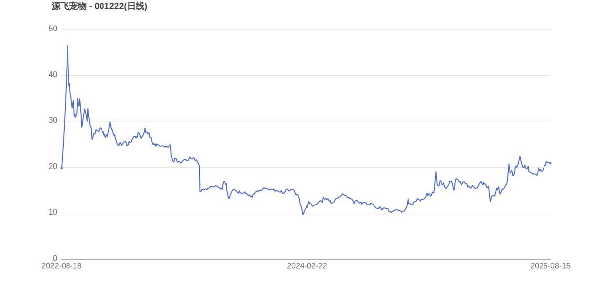 2022年8月31日,源飞宠物的市值巅峰达到63.47亿元,股价也顺应升至46.55元。而至8月15日收盘,源飞宠物的股价为20.83元,市值为39.76亿元,相比峰值时期市值减少23.71亿元,市值蒸发了37.35%。