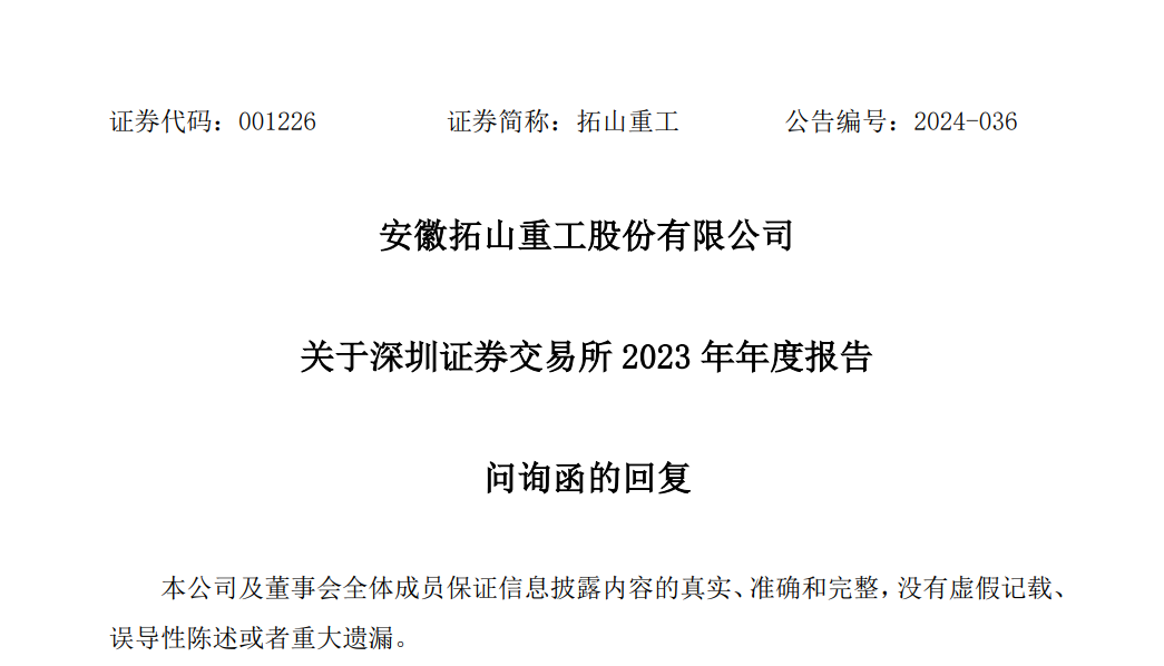 瑞财经赵盼盼 5月26日,安徽拓山重工股份有限公司(以下简称“拓山重工”)发布关于深交所2023年年度报告问询函的回复公告。