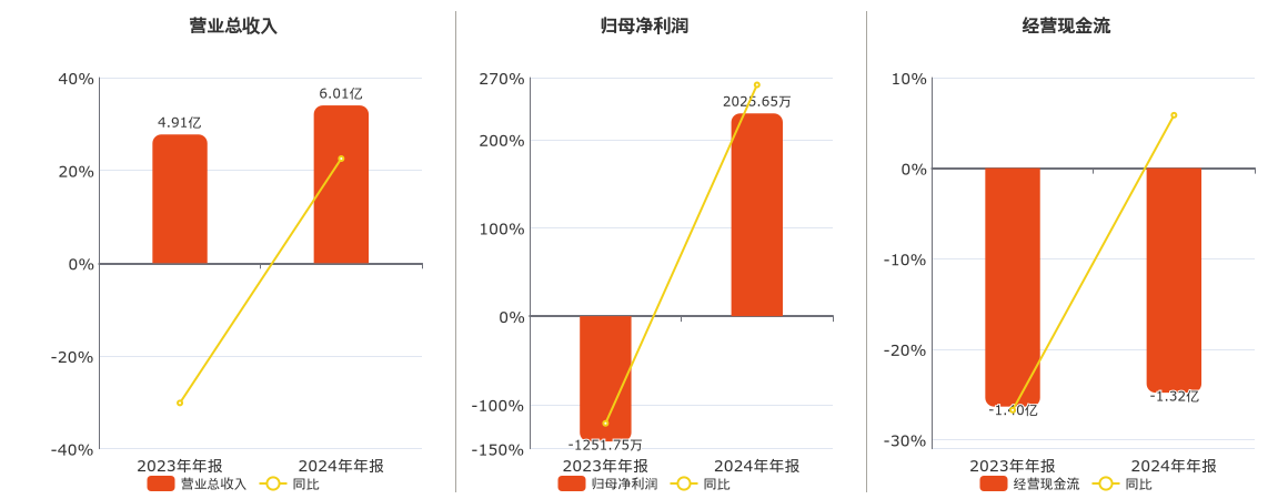 公司营业总收入为6.01亿元,在已披露的同业公司中排名第17。归母净利润为2025.65万元,在已披露的同业公司中排名第16。经营活动现金净流入为-1.32亿元,在已披露的同业公司中排名第19。
