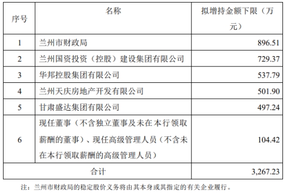 其中,主要股东以不低于稳定股价具体方案公告时所享有的银行最近一个年度的现金分红15%的资金增持银行股份。即兰州市财政局或其指定的下属企业增持股份金额合计不低于896.51万元,兰州国资投资(控股)建设集团有限公司增持股份金额合计不低于729.37万元,华邦控股集团有限公司增持股份金额合计不低于537.79万元,兰州天庆房地产开发有限公司增持股份金额合计不低于501.90万元,甘肃盛达集团有限公司增持股份金额合计不低于497.24万元。