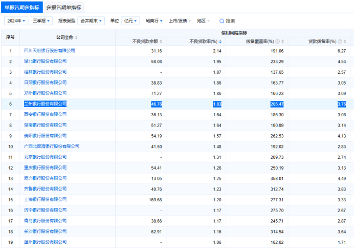 而1.83%的不良贷款率更是位列42家A股银行行倒数第二,在城商行行业内也属于高水平。而兰州银行总共也就2500多亿的贷款规模,不良贷款就高达46.76亿元,且今年年内每个财报季均以两位数在增长,不良贷款率也是逐步攀升。