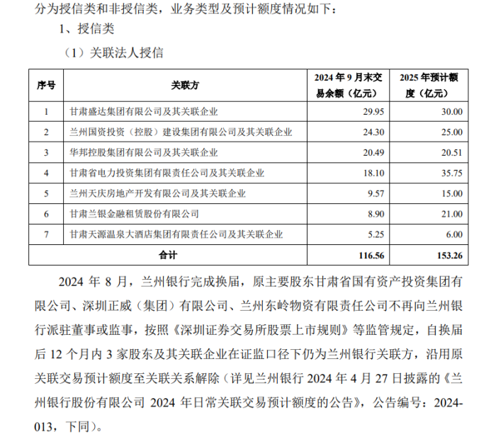 据兰州银行11月15日发布的《中信建投证券股份有限公司关于兰州银行股份有限公司2025年日常关联交易预计额度的核查意见》(以下简称“核查意见”)中的数据显示,截止到今年9月底,兰州银行给予甘肃盛达等7家关联方的授信余额达116.56亿元,预计2025年还要给到153亿元的授信额。