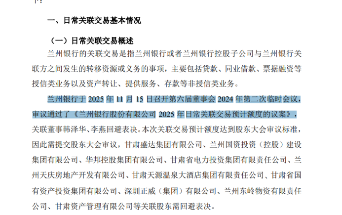 最有意思的是,兰州银行步西安银行后尘,在上市公司公告上又闹了个“穿越”。兰州银行第六届董事会穿越到2025年11月份开了个会。在今年11月15日发布的《兰州银行股份有限公司2025 年日常关联交易预计额度的公告》、《中信建投证券股份有限公司关于兰州银行股份有限公司2025 年日常关联交易预计额度的核查意见》两份公告中,均有这样的表述:“兰州银行于2025年11月15日召开第六届董事会 2024 年第二次临时会议,审议通过了《兰州银行股份有限公司2025年日常关联交易预计额度的议案》”