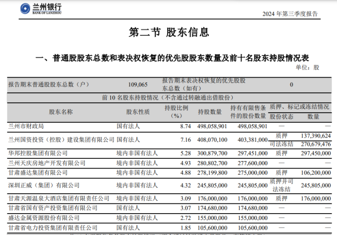 结合华邦集团最新股份冻结状态,至今年12月23日前,兰州银行前十大股东所持股份处于被质押或冻结的数量合计为12.37亿股,约占总股本的21.72%。