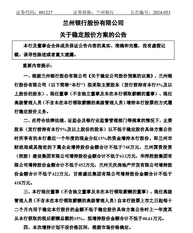 今年11月15日,兰州银行发布了《关于稳定股价的公告》,公告中指出,公司拟采取持股5%以上的股东、现任董事和高级管理人员(不含独立董事以及未在公司取酬的董事、高管)增持兰州银行股票的方式来稳定上市公司股价。大股东和董事、高管们都被分配了增持份额,其中现任董事、高管增持的累计金额不低于40.61万元。