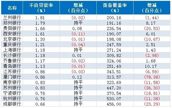 从增减变化看,一季度共计3家银行不良率有所上升,分别是贵阳银行、长沙银行和厦门银行,截至3月末,分别较上年末提升0.08个百分点、0.01个百分点、0.12个百分点。另有7家城商行不良率较上年末持平,7家不良率较上年末下降。