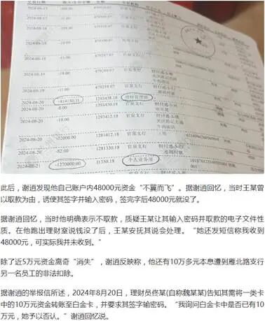 纠纷源自储户谢某举报兰州银行雁北路支行两名员工非法转走其约16万元本息,其表示该支行理财经理推介理财产品时,未按要求提供存款总额单,仅告知其通过手机银行查看,并以取款为由,诱使其签字并输入密码,后续储户发现其账户内4.8万元资金“不翼而飞”。另一员工又以将一类卡资金转账至白金卡为由,要求其签字输密码,导致其账户内三笔共计10万元的本息被以转账名义直接扣除。储户强调,上述转账、取款操作均在理财室完成,但后经咨询得知理财室无权进行此类操作,因此认为两涉事员工涉嫌职务侵占,要求返还资金并由兰州银行承担连带责任,并已两次向当地公安机关报案。