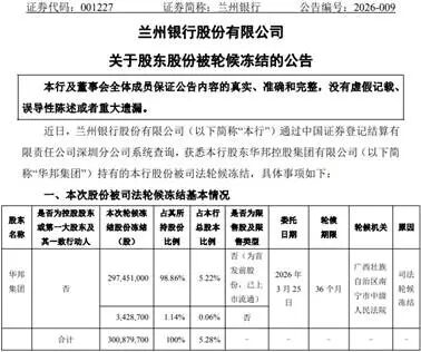 今年3月,华邦集团所持兰州银行全部约3亿股股份(占总股本的5.28%),还被南宁中院司法轮候冻结,更新增了公司治理方面的不确定性。作为第三大股东,华邦集团的股东权利因此受到限制,进而可能影响兰州银行的公司治理与经营决策效率。