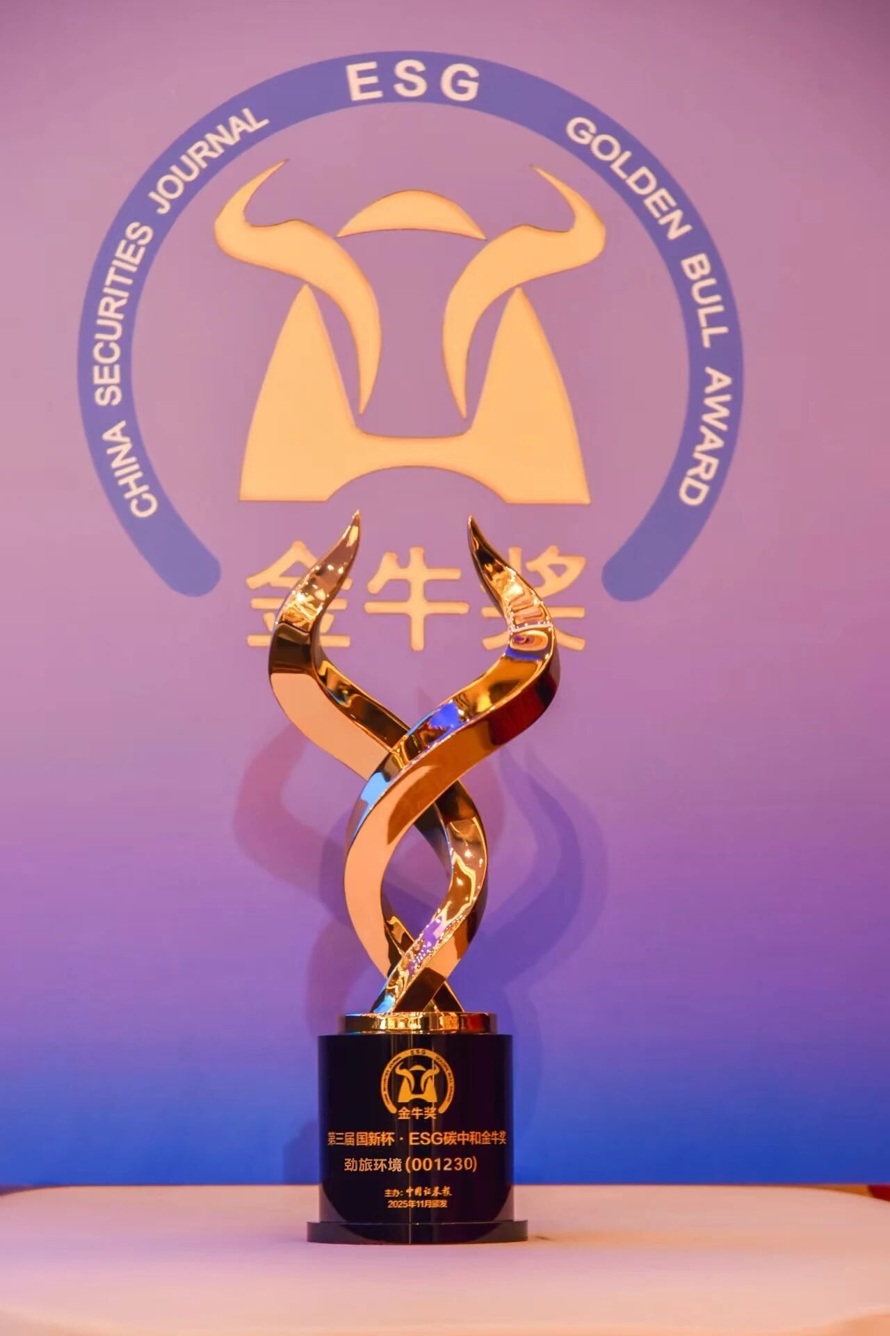 11月26日,由中国证券报、 中国国新 主办, 国新证券 承办的2025年金牛企业可持续发展论坛暨第三届国新杯?ESG金牛奖颁奖典礼在苏州举行。 劲旅环境 科技股份有限公司(股票代码:001230)凭借在ESG领域的系统性实践与碳中和赛道的突破性创新,荣膺“ESG碳中和金牛奖”,这是资本市场权威机构对公司践行生态责任、引领行业绿色转型的高度认可!