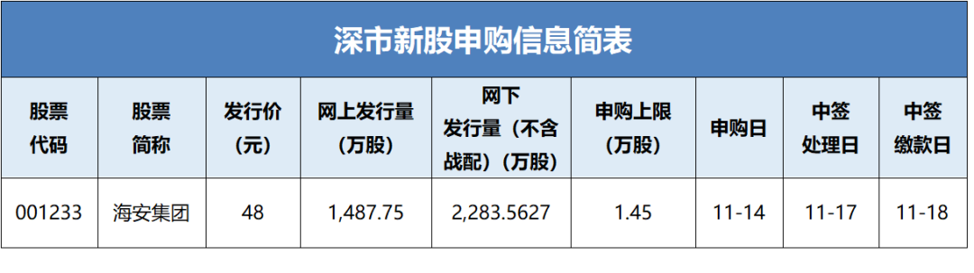 2025年11月14日,海安橡胶集团股份公司(简称:海安集团)将通过深交所网下发行电子平台和交易系统发行新股,具体信息如下。